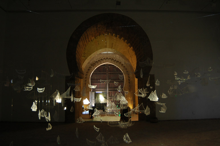 „Pensées entre les vagues“ (2006): Ein dunkler Gewölberaum. Auf dem Boden eine wolkenbettartige Ansammlung scheinbar herkömmlicher Plastikfetzen. Bei näherem Hinsehen formiert sich diese jedoch zu einem Meer kleiner Boote, die in das illuminierte Kuppelgewölbe emporzusteigen, sich in ihrer Bewegung jedoch gleichsam wieder zu entmaterialisieren scheinen. Während ihr Schatten schemenhaft ein bewegtes Nachbild ihrer Selbst auf die Wände zeichnet. Es ist schwer zu sagen, ob die aufgrund ihrer materiellen Transparenz fragilen Objekte oder aber ihre Schatten unserer visuellen Wahrnehmung körperhafter und somit realer, näher an der Wirklichkeit erscheinen.
