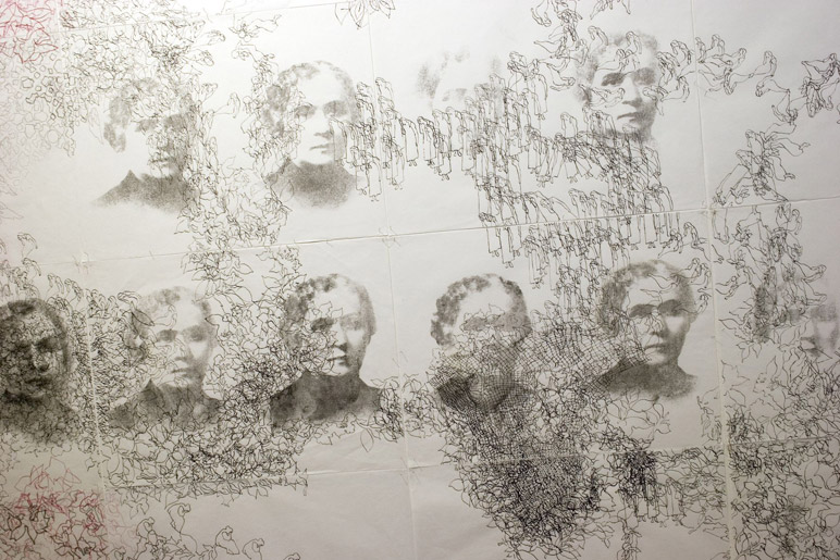Horizontal und vertikal Stoß an Stoß angeordnete weibliche en face-Porträts. Die physiognomische Ähnlichkeit wird durch die ausdruckslosen Gesichter und die Wiederholung einzelner Motive ebenso verstärkt wie durch die monochromatische Färbung der Blätter. Darüber, ein Bildteppich aus einem Potpourri ornamentaler und floraler Motive, aus menschlichen Gesichtern. Die sich über die Ränder der Fotocollage hinweg rankende Zeichnung, welche die Gesichter einerseits verdeckt, zerstört, greift das Porträt-Motiv als solches jedoch zugleich wieder auf und führt es fort, so als wolle sie die Bilder vor dem Verschwinden bewahren. Endlichkeit, Vergänglichkeit, Einzigartigkeit. Das Porträt: Sinnbild für diese Begrifflichkeiten. Und doch scheint es sich hier und jetzt regelrecht dieser zu entheben, eine Art Kanon anstimmend, dessen Melodie stets aufs Neue erklingt.