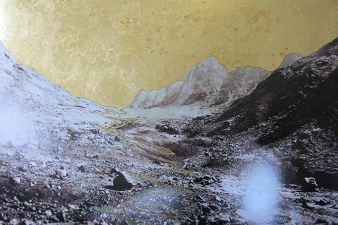Das Foto des Sinai, diese karge Mondlandschaft, durchzieht ein goldener schmaler Pfad, der zu einem goldfarbenen Horizont hin führt – golden, wie auf mittelalterlichen Gemälden der Himmel, als Symbolik göttlicher Versprechung und Wunschvorstellung, des versprochenen Paradieses und gelobten Landes.