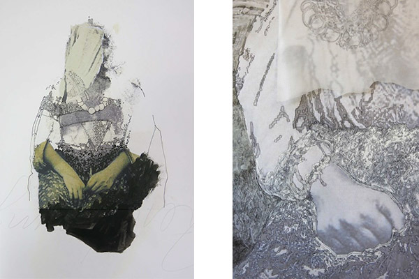Ein weiteres Bild lenkt den Blick auf die Hand einer jungen Frau, die zur Faust geballt ist, auffällig groß und kräftig wirkt und dabei von Schmuck und Stoffen spielerisch umrahmt ist. In der Collage steht die Hand im Kontrast zu den verblassten, entschwindenden Farben und Konturen des Gesichts und des Oberkörpers der Frau ebendso wie zu ihrem teils in schwarzer Tusche übermalten Rock. Diese schroffen Kontraste sind gleichzeitig abgeschwächt und vermittelt durch ein Netz von Linien und Flächen, die das Muster des Kleidungsstoffes und des Schmucks, der Armreifen und der großen Kette, aufgreifen und weiterführen. Zwischen den dunklen breiten Flächen im unteren Teil des Bildes und den immer zarter werdenen Mustern, die sich in der verblassten Aufnahme des Gesichts verlieren, wirkt die Hand kraftvoll, entschlossen, kämpferisch, als könne sie Dinge anpacken und zusammenzuhalten; sie steht zwischen dem Entschwinden, an dessen Horizont Vergessen und Verlust drohen, und dem Unbestimmten, der noch formlosen Materie, die durch Arbeit und Kreativität Formen anzunehmen vermag.